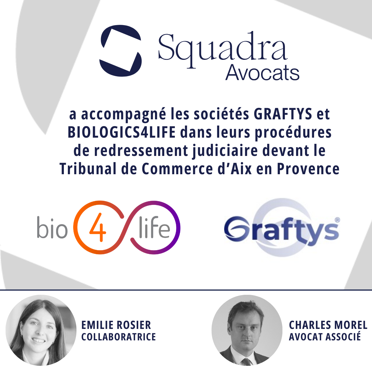 NULLSquadra (Charles Morel et Emilie Rosier) has recently supported the companies GRAFTYS and BIOLOGICS 4 LIFE in their insolvency proceedings before the Aix-en-Provence Commercial Court.